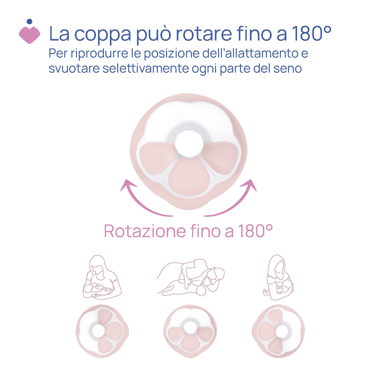 La coppa si ruota fino a 180° per replicare le diverse posizioni dell’allattamento e lavorare su ogni quadrante del seno, mentre la parte trasparente e stabile della coppa può essere posizionata sull’area più delicata per proteggere le zone doloranti senza interrompere l’estrazione.